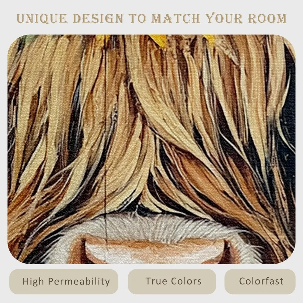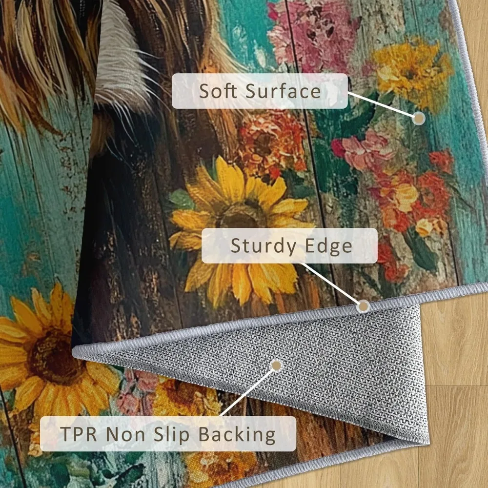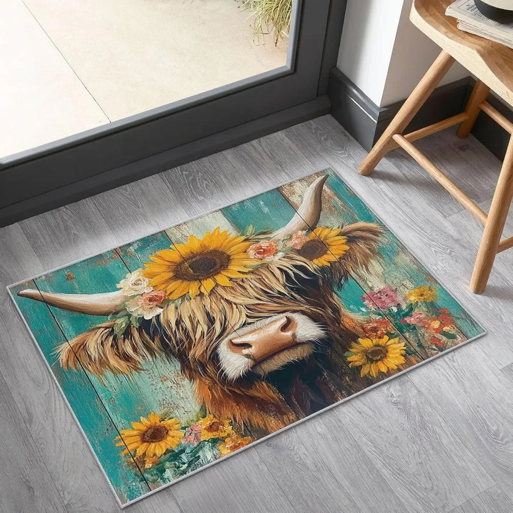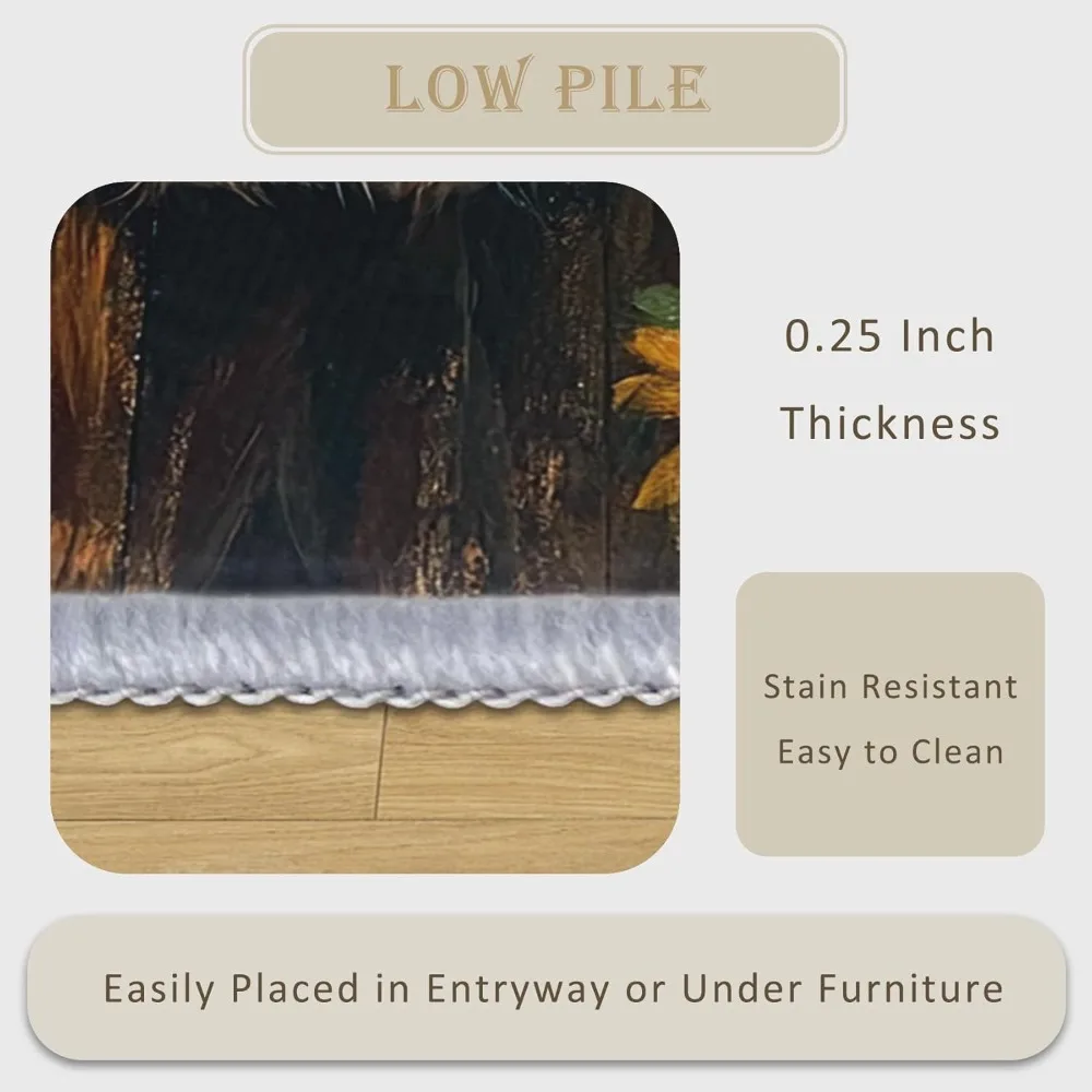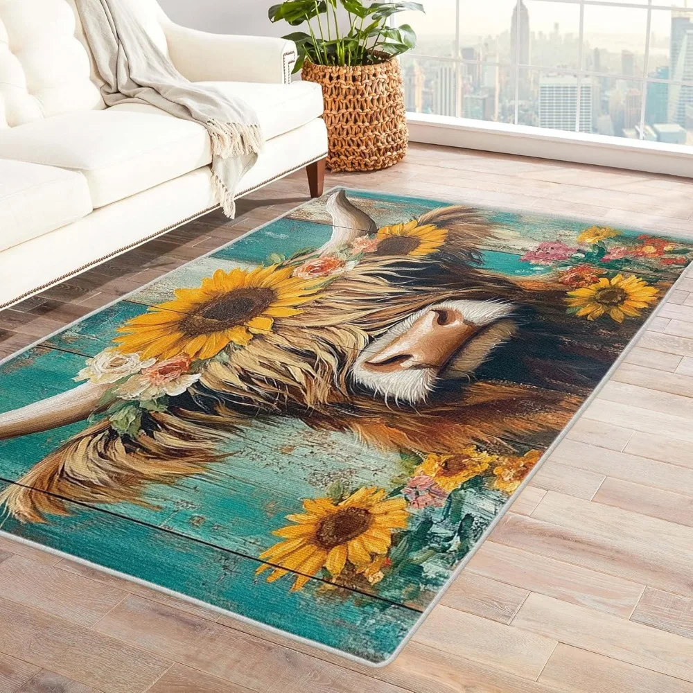 Bring rustic charm and cozy farmhouse warmth into your home with this 5×7 Farmhouse Highland Cow Area Rug, featuring a beautiful sunflower and western cattle design. The soft, inviting artwork blends earthy tones with a friendly highland cow motif, creating a welcoming atmosphere perfect for living rooms, bedrooms, entryways, or country-inspired spaces.