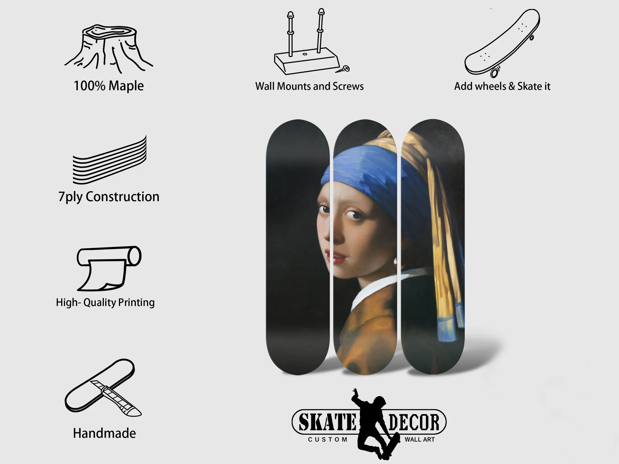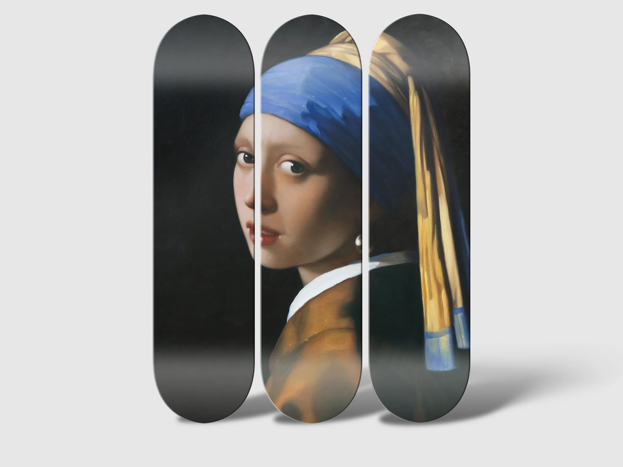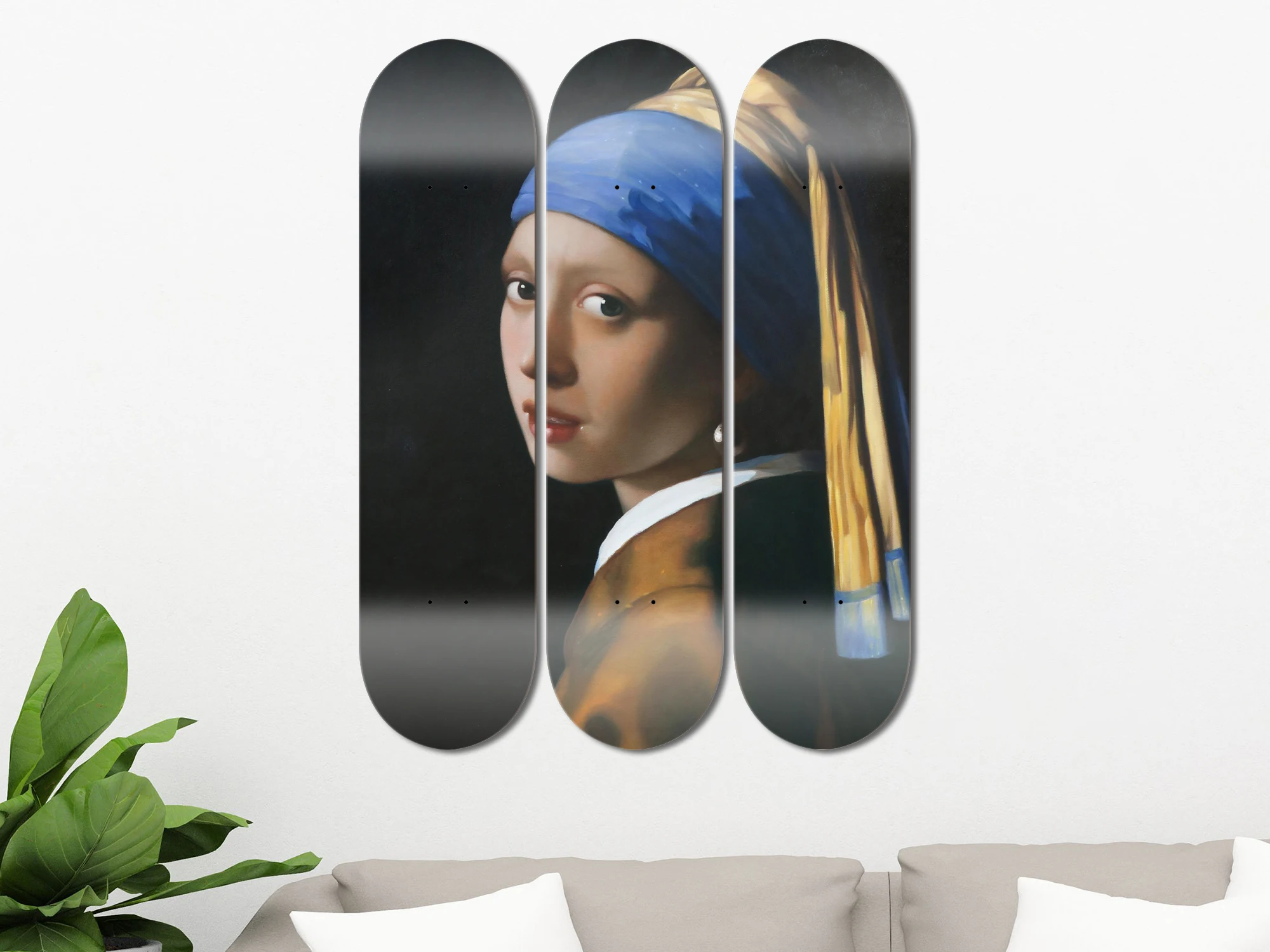 Elevate your home décor with this set of 3 skateboard wall art pieces featuring a modern reinterpretation of “The Girl Wearing Earring.” Crafted from durable 7-layer maple boards, each piece blends fine art with street-style creativity for a bold and eye-catching display. Perfect for living rooms, bedrooms, studios, or entertainment spaces, these skateboards function as both decorative art and stylish wall accents. Easy to hang and beautifully finished, this set adds personality, sophistication, and a unique artistic edge to any modern home.