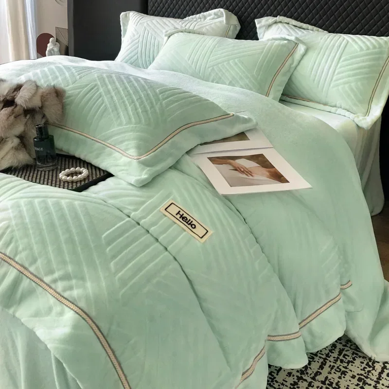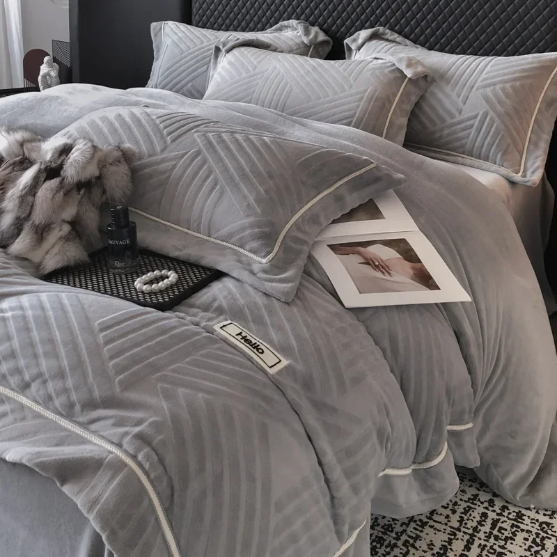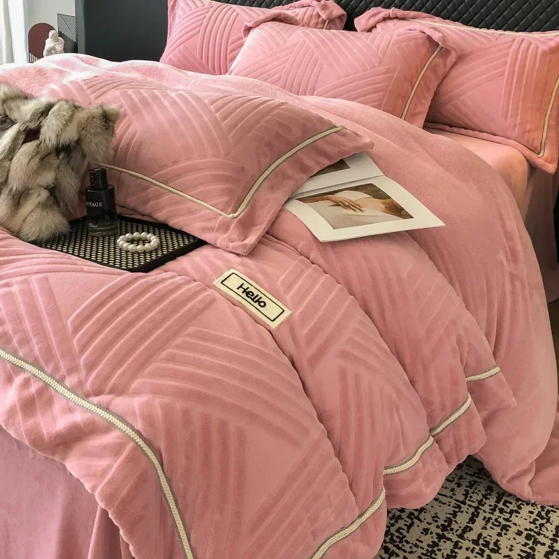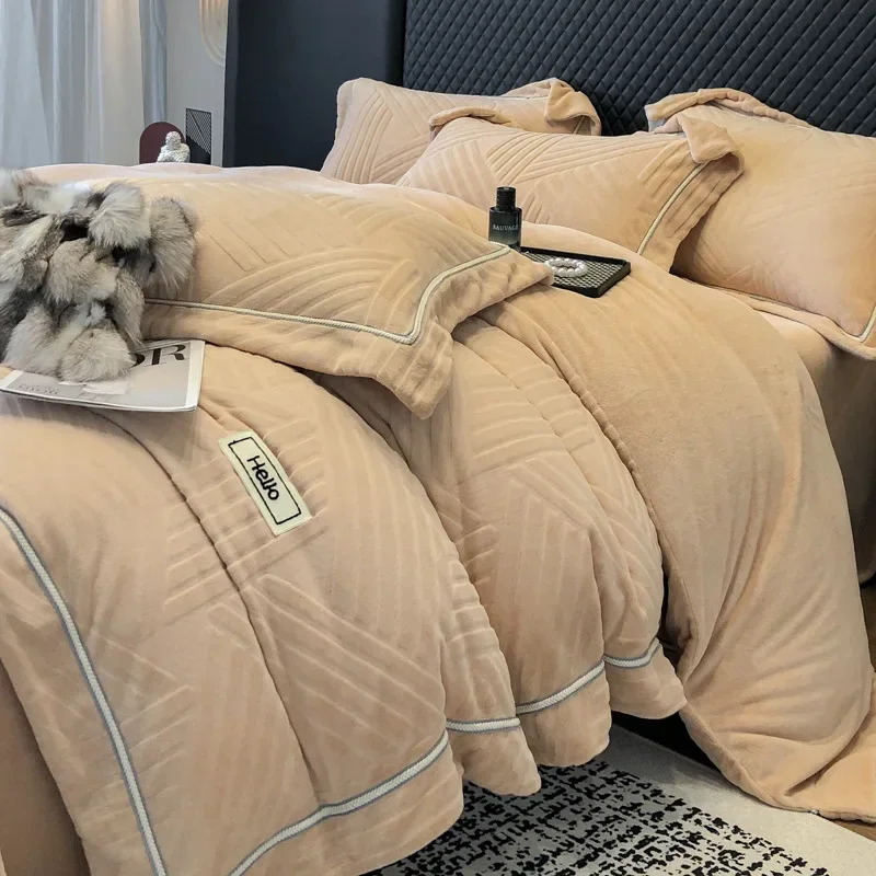 Stay warm and stylish all winter with this Light Luxury Thickened Rabbit Fleece Four-Piece Bedding Set, crafted from high-grade milk fleece for exceptional softness and insulating comfort. This premium winter kit features a plush quilt cover, warm bed sheet, and matching pillowcases—all designed with a simple, elegant aesthetic that elevates any bedroom. The rabbit fleece texture is ultra-soft to the touch while offering superior warmth on cold nights. Durable, breathable, and irresistibly cozy, this bedding set transforms your sleep space into a warm, luxurious retreat perfect for the winter season.