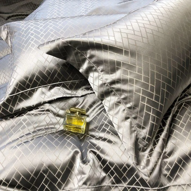 Upgrade your bedroom with this Premium Grey and Black Satin Jacquard Bedding Set, designed for US Queen, King, and California King sizes. Crafted from smooth, silky satin with an intricate jacquard weave, this luxurious set offers a stunning combination of style, texture, and comfort. The elegant grey-and-black pattern brings depth and sophistication to any décor, while the soft bed sheet and matching pillowcases complete a polished, hotel-quality look. Available in 4-piece or 6-piece sets, this bedding delivers long-lasting comfort, high-end design, and a refined touch—perfect for modern, classic, or upscale interiors.