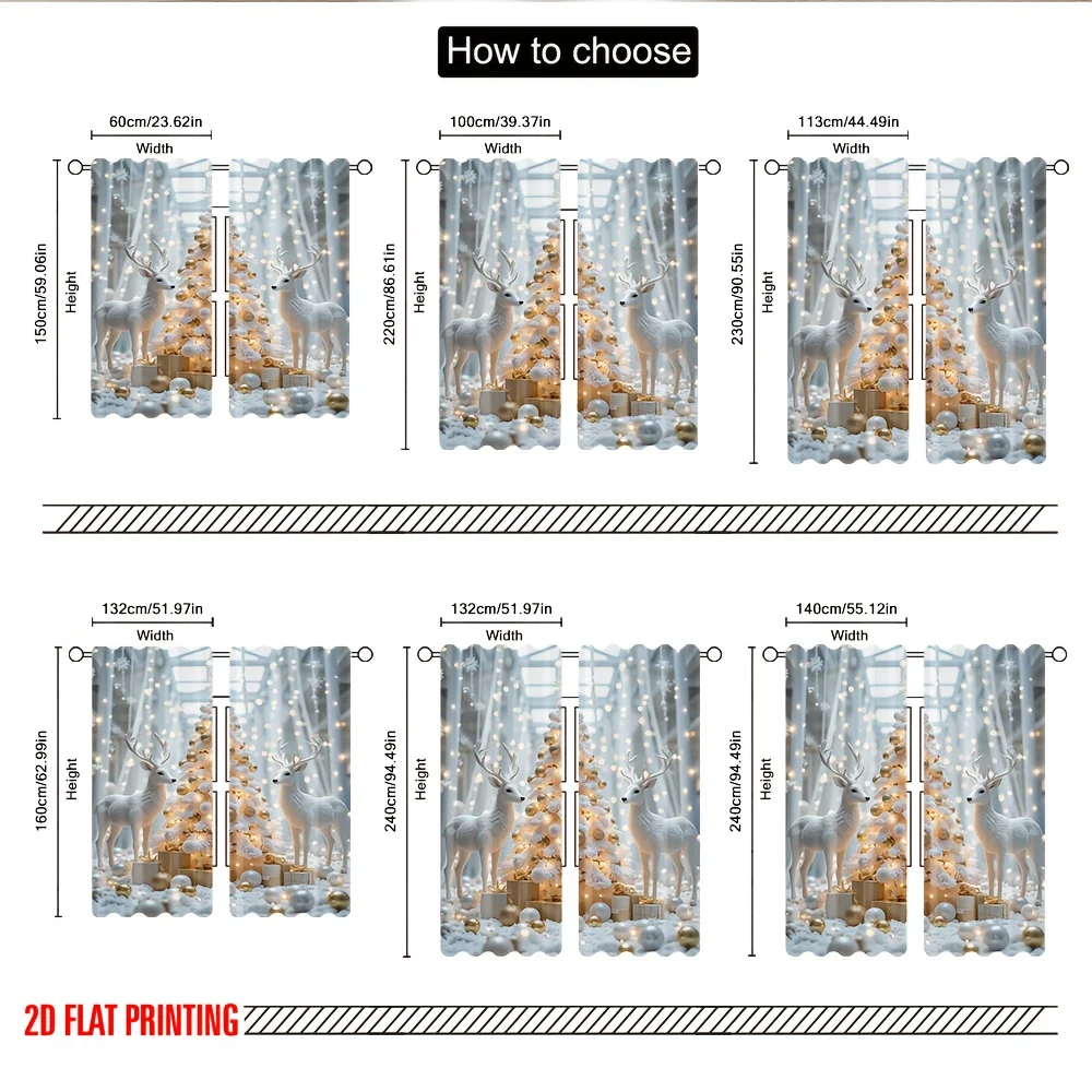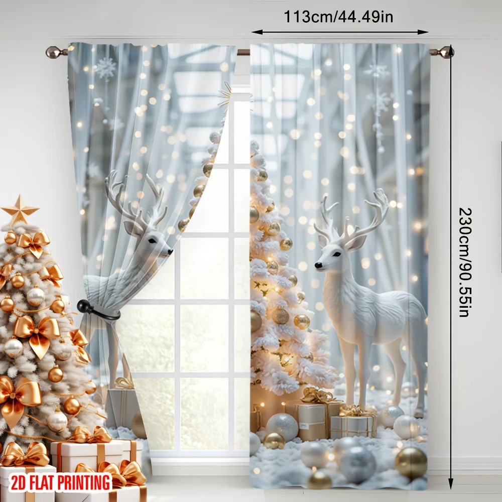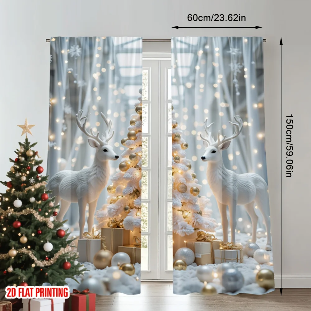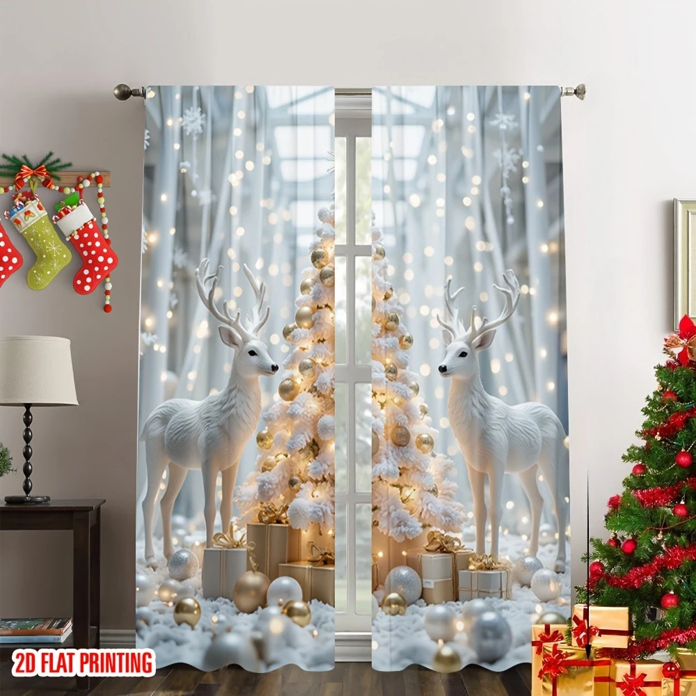 Add festive elegance to your home with this 2-piece set of sheer Christmas curtains featuring a charming reindeer and tree design. Perfect for living rooms, bedrooms, and holiday-decorated spaces, these lightweight panels gently filter natural light while showcasing delightful seasonal artwork. The soft sheer fabric creates a cozy, cheerful atmosphere without blocking sunlight, making your home feel bright and festive all winter long. Easy to hang and beautifully detailed, these curtains are the perfect finishing touch for your holiday décor.