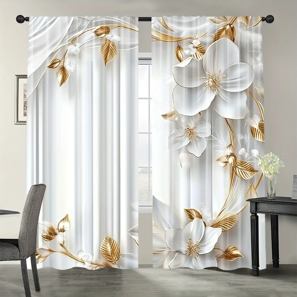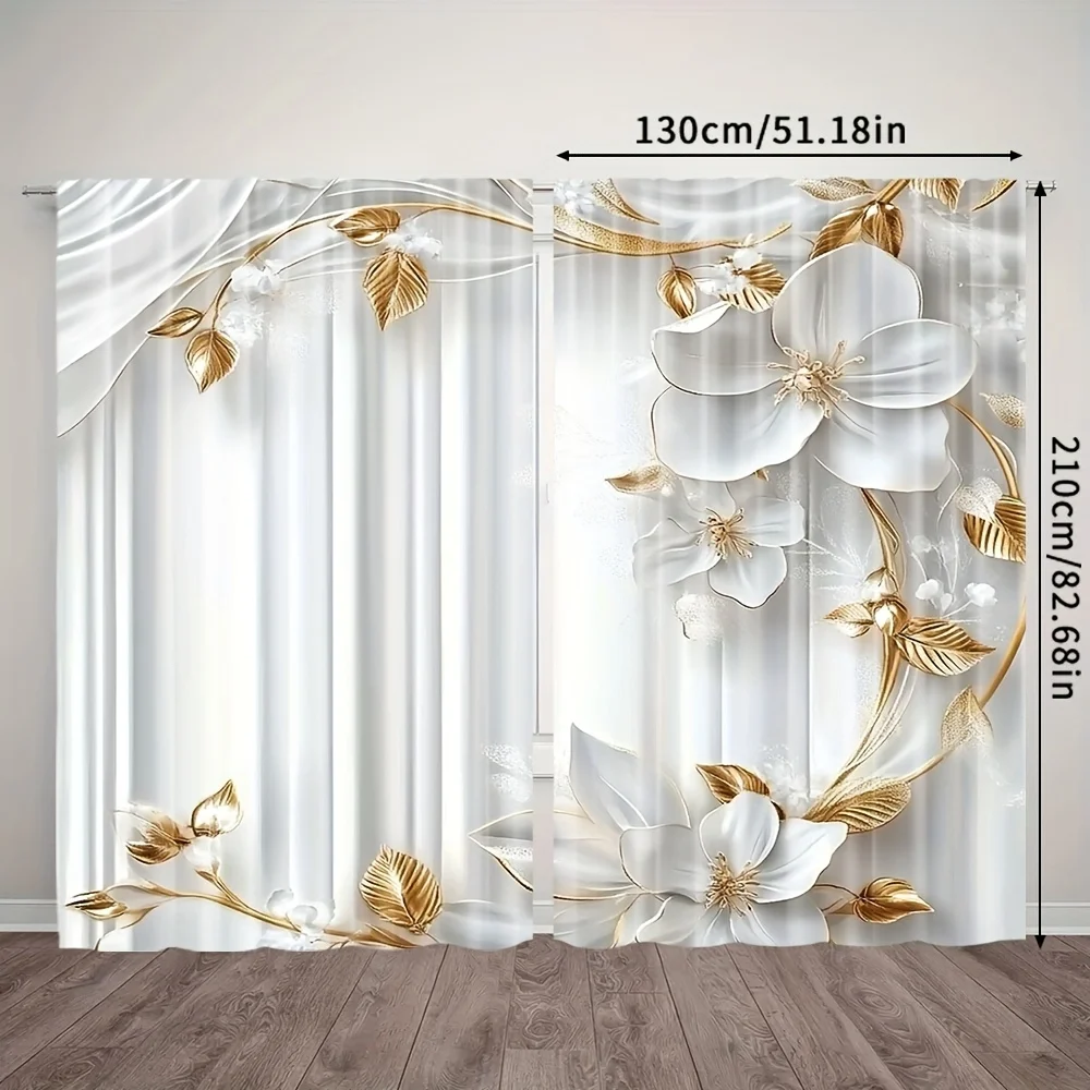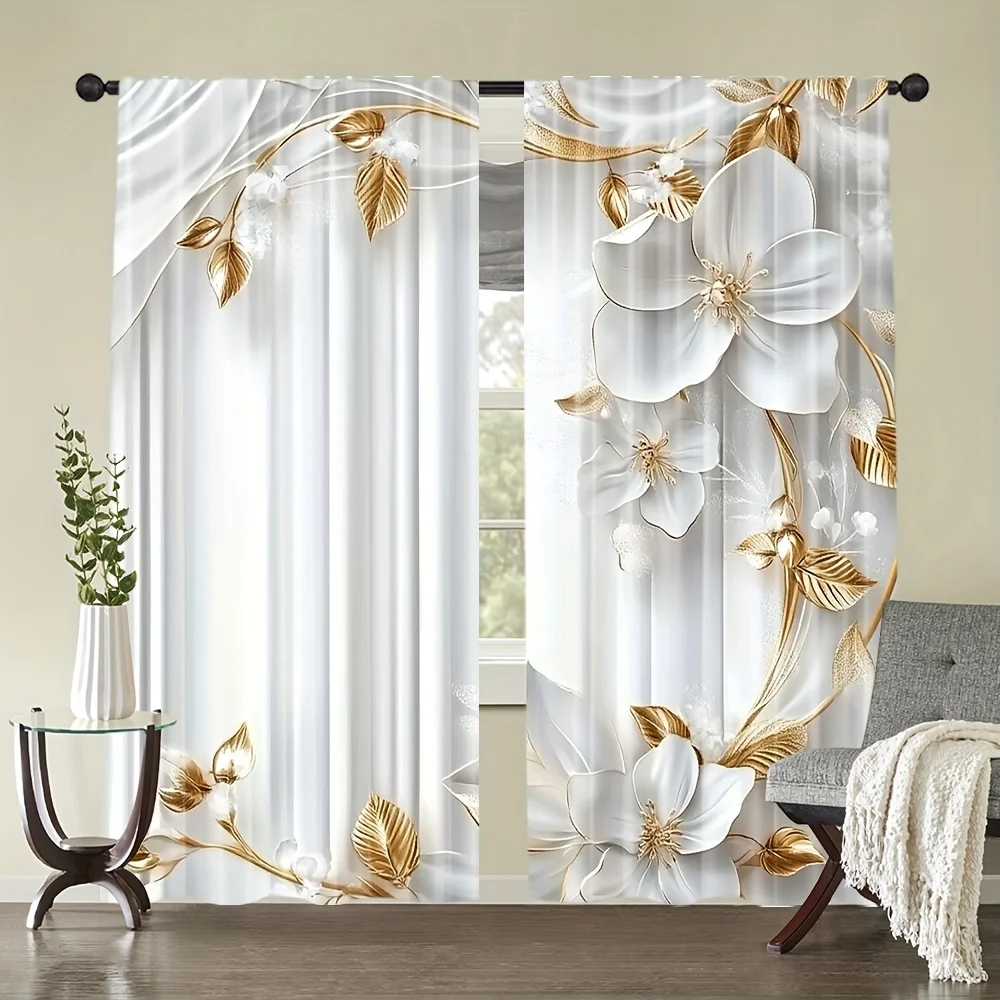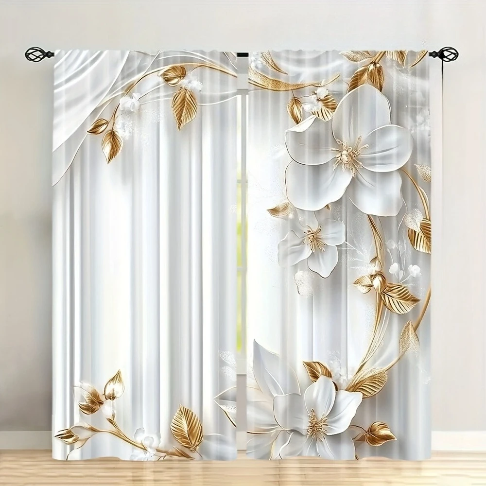 Brighten your space with this elegant 2-piece set of white floral print sheer curtains, delicately accented with touches of gold for a refined, modern look. Made from lightweight polyester, these drapes gently filter natural light while enhancing any room with soft floral detailing and a touch of shimmer. The rod pocket design offers easy installation and a smooth, graceful drape ideal for bedrooms, living rooms, kitchens, and more. Perfect for adding sophistication without blocking sunlight, these sheer curtains elevate your décor with beauty, softness, and effortless charm.